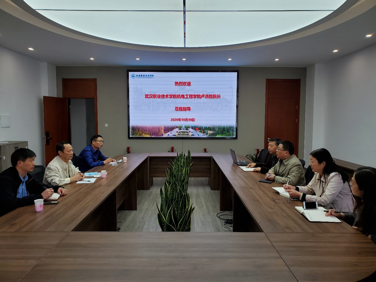 2020年10月30日,武汉职业技术学院机电工程学院院长卢洪胜携模具专业负责人、数控专业负责人等一行3人来开云官方官网登录入口交流。机械技术学院总支书记徐晴、副院长曹秀中及专业相关负责人参加交流座谈。