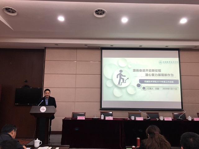 王骏院长做了题为“激扬奋进开启新征程,凝心聚力展现新作为”的报告,对学院2019年工作做了全面总结,提出了2020年学院工作的思考,并向全体教职工报告了2019年机械学院创收及使用情况。