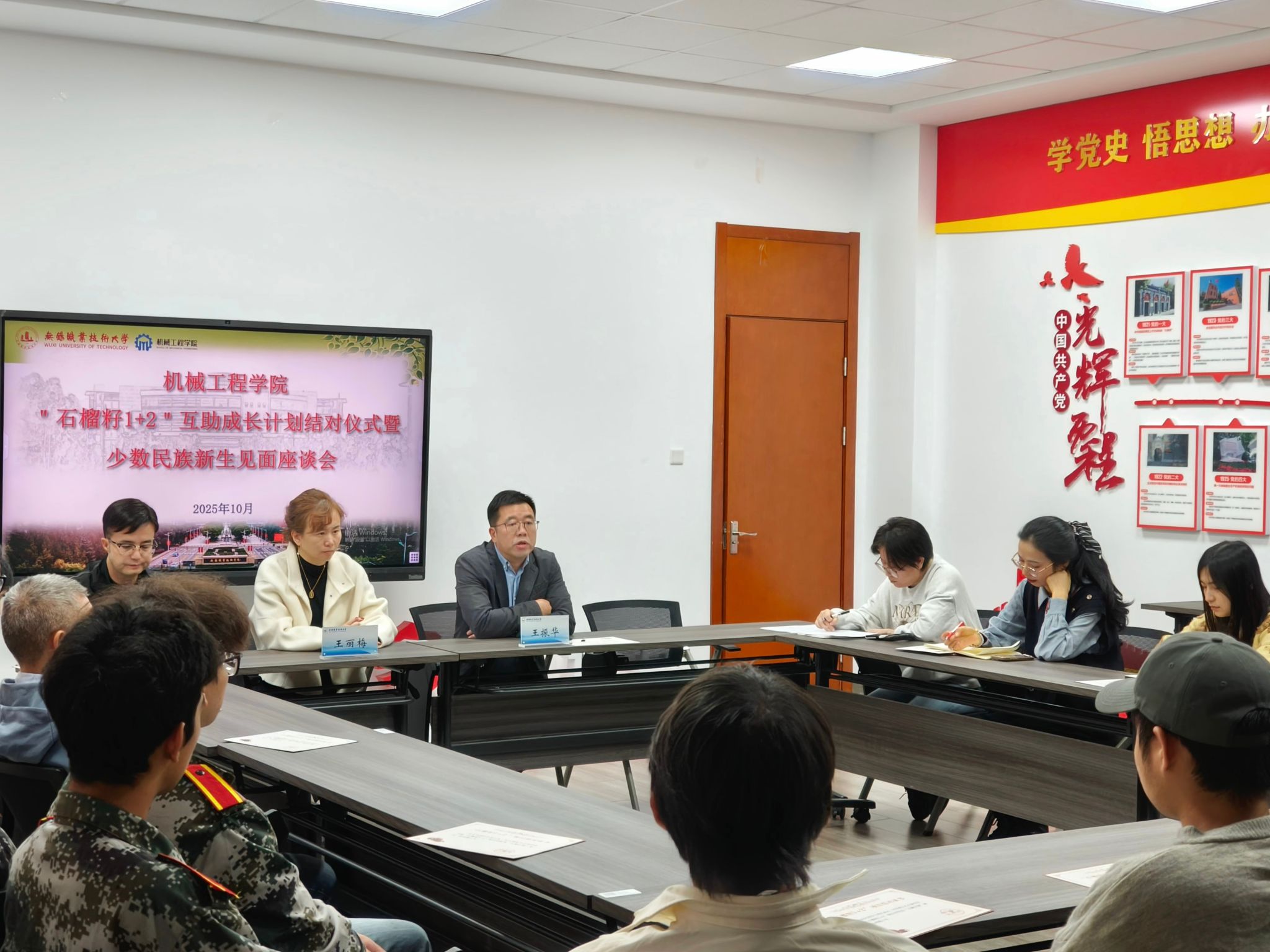 为深入学习贯彻党的二十大精神,铸牢中华民族共同体意识,全面了解25级少数民族新生的思想、学业与生活状况,助力新生快速适应大学生活、成长成才,10月21日,机械工程学院在工业中心N210开展“石榴籽1+2”互助成长结对仪式暨少数民族新生座谈会。机械工程学院党总支书记王振华、党总支副书记王丽梅、学生处少数民族专项负责人塔依尔、机械工程学院学工办主任靳丹丹担任嘉宾,共有30余名师生参加。