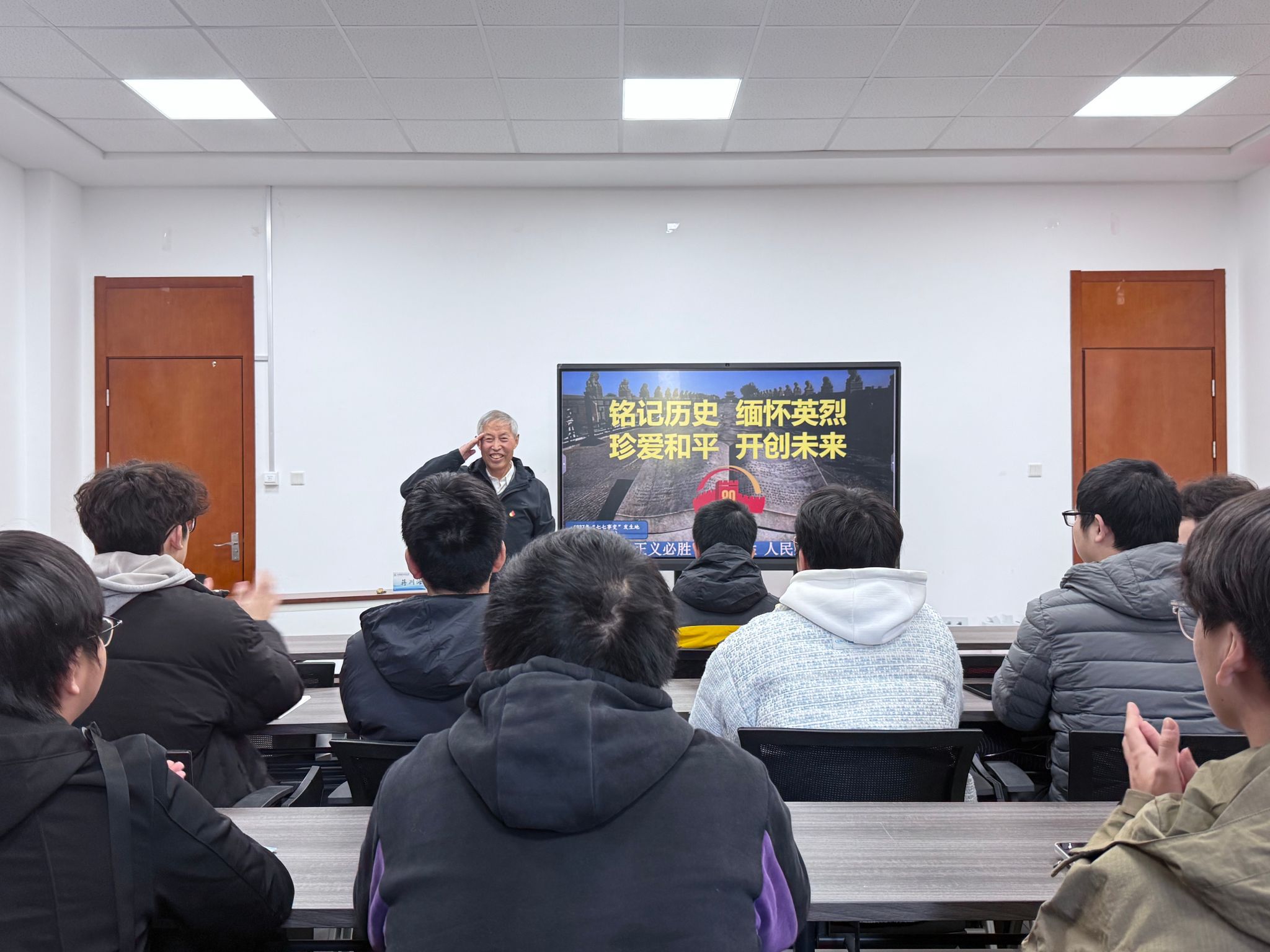 党课中,有着30年从军经历的蒋川海同志结合自身军旅生涯与红色阅历,带领学子们重温了抗日战争那段波澜壮阔的峥嵘岁月。他重点阐释了抗日战争时期全民族抗战统一战线的形成历程,强调正是各民族不分你我、同心同德,筑起了抵御外侮的钢铁长城,才赢得了最终胜利。蒋川海分享了自己身边的少数民族抗战故事,讲述了少数民族同胞与汉族同胞并肩作战、生死与共的感人瞬间——有的少数民族战士用母语传递作战信号,有的自发组织支前队伍运送物资,有的以村寨为堡垒坚守阵地,用鲜血和生命诠释了“中华民族一家亲”的深厚情怀。他引导各民族青年学子铭记民族苦难、珍惜当下和平,深刻认识到民族团结是国家强盛的根基,鼓励大家将爱国情、强国志转化为报国行,自觉铸牢中华民族共同体意识,在新时代传承和弘扬伟大抗战精神与民族团结精神。