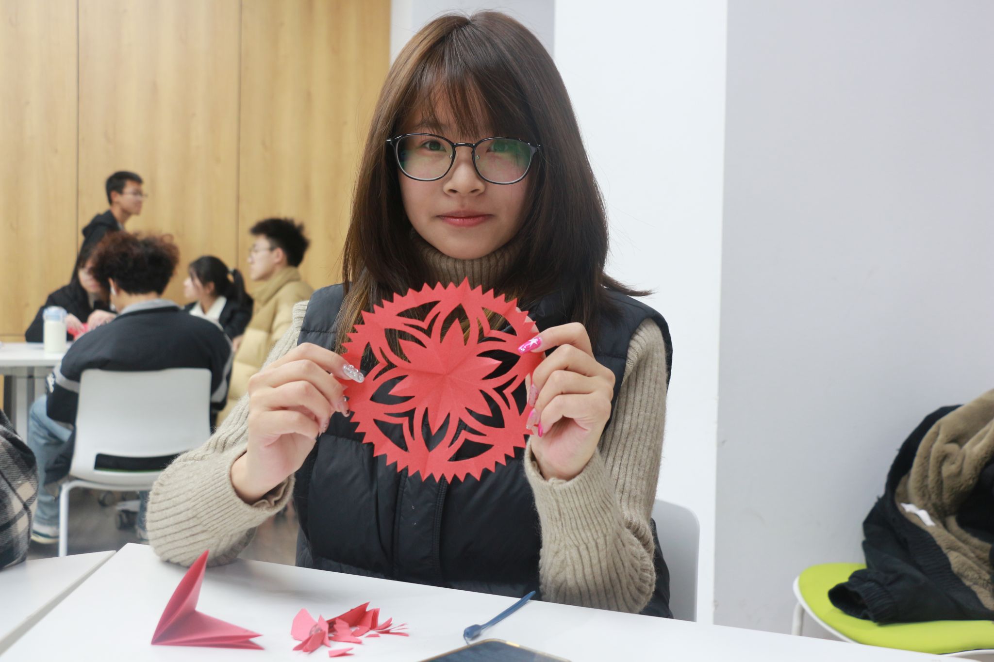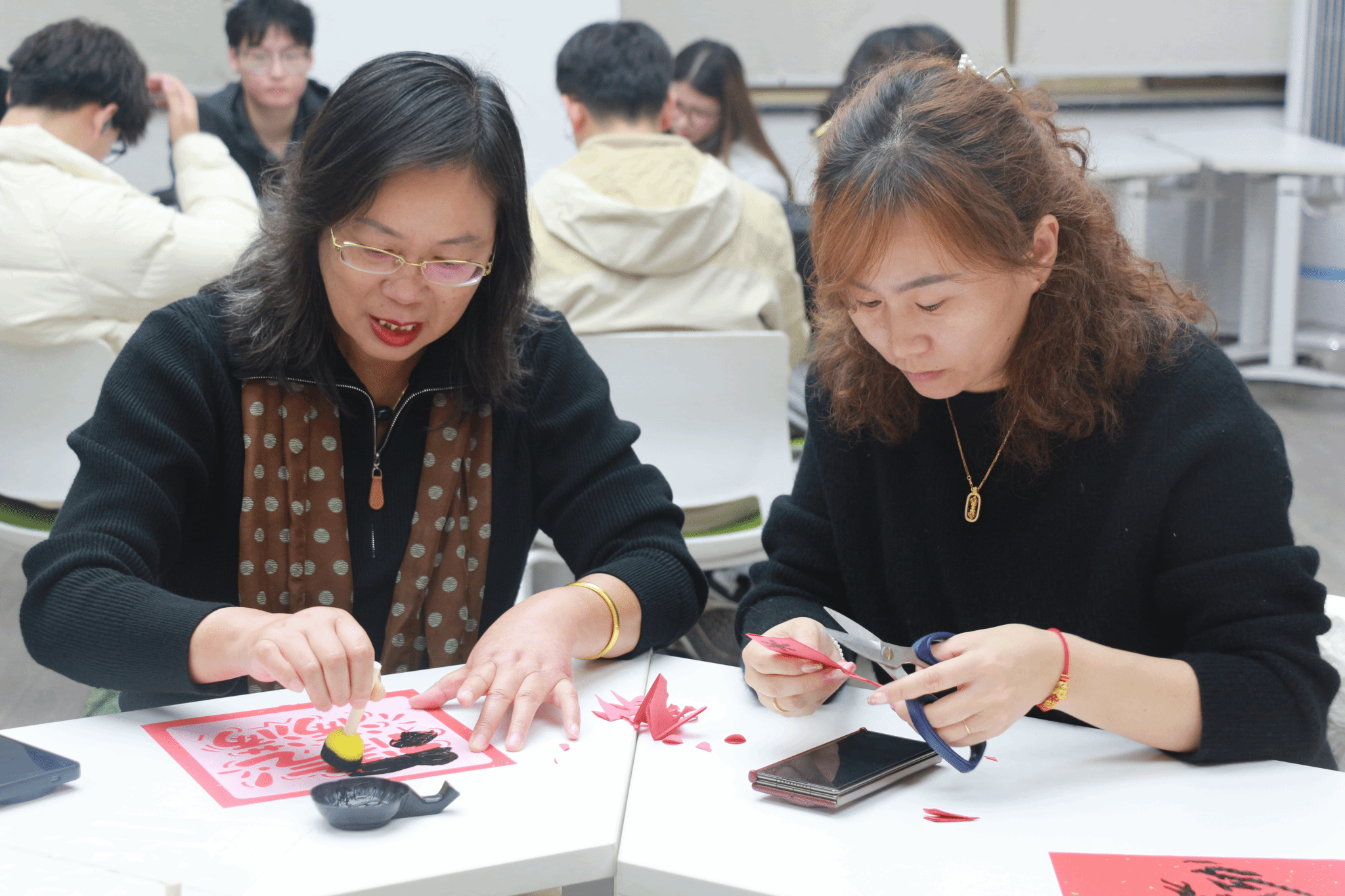 活动现场,“福字拓印”墨香氤氲。师生蘸取颜料、轻压宣纸,揭下模板见“福”跃然纸上,或端正大气,或灵动可亲,一纸一印皆寄托着对新岁安康的期盼。“剪纸纳福”环节同样热烈,红纸翻飞、剪刀起落,平日专注于图纸与零件的同学化身巧手匠人,循纹剪裁,雪花、福字、瑞兔等窗花渐次成形,为现场增添浓浓节日气氛。在“甜蜜食光”环节,师生共同制作冰糖葫芦。金黄糖浆翻滚散香,草莓、圣女果、香蕉等水果串起后裹上晶亮糖衣,待其凝固,一口酸甜,冬日暖意在舌尖与心间同时绽放。