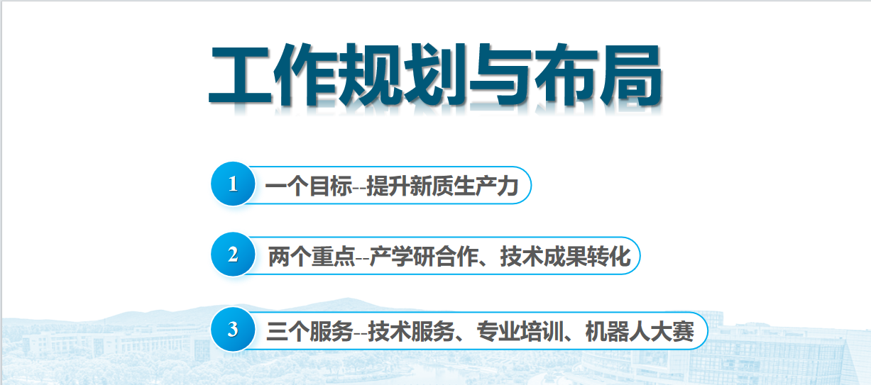 汤文成教授汇报了“创新中心”自申报和立项以来围绕“一个目标即提升新质生产力;两个重点即产学研合作、技术成果转化;三个服务即技术服务、专业培训、机器人大赛”的规划和布局,在团队组建、基础管理、工作方法、学术活动、成果转化、产业调研、产学研合作、专业培训、机器人大赛等方面的工作成效。