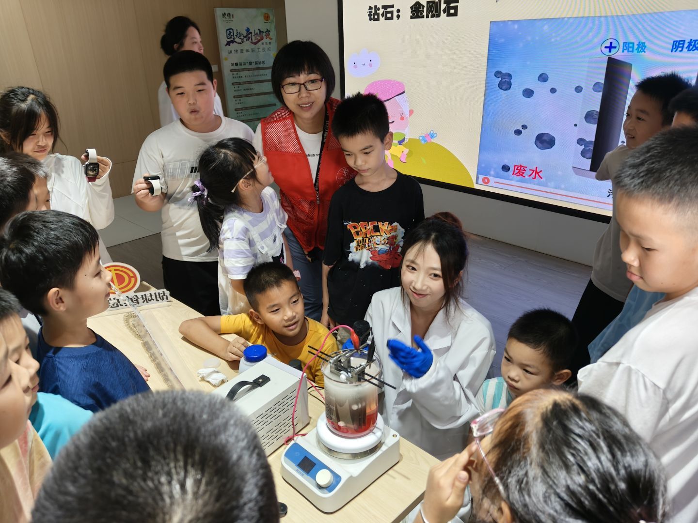 此次活动,实践团队特别邀请了“挑战杯”秦创原中国大学生创业计划竞赛银奖团队,为大家呈现了一场生动有趣的科技课堂。他们通过实验演示的方式,直观展示了污水处理的科学原理:利用新型材料电极进行电化学技术处理实验中,通电的电极产生电流,将浑浊污水中的杂质迅速降解。孩子们纷纷屏息观察,阵阵惊叹声此起彼伏。一位小朋友兴奋地说道:“原来污水变干净还有这么多有趣的科学方法!”在讲解过程中,团队成员还深入介绍了厌氧氨氧化、微生物燃料电池等前沿技术,让现场观众对污水处理的创新方法有了更深入的了解。