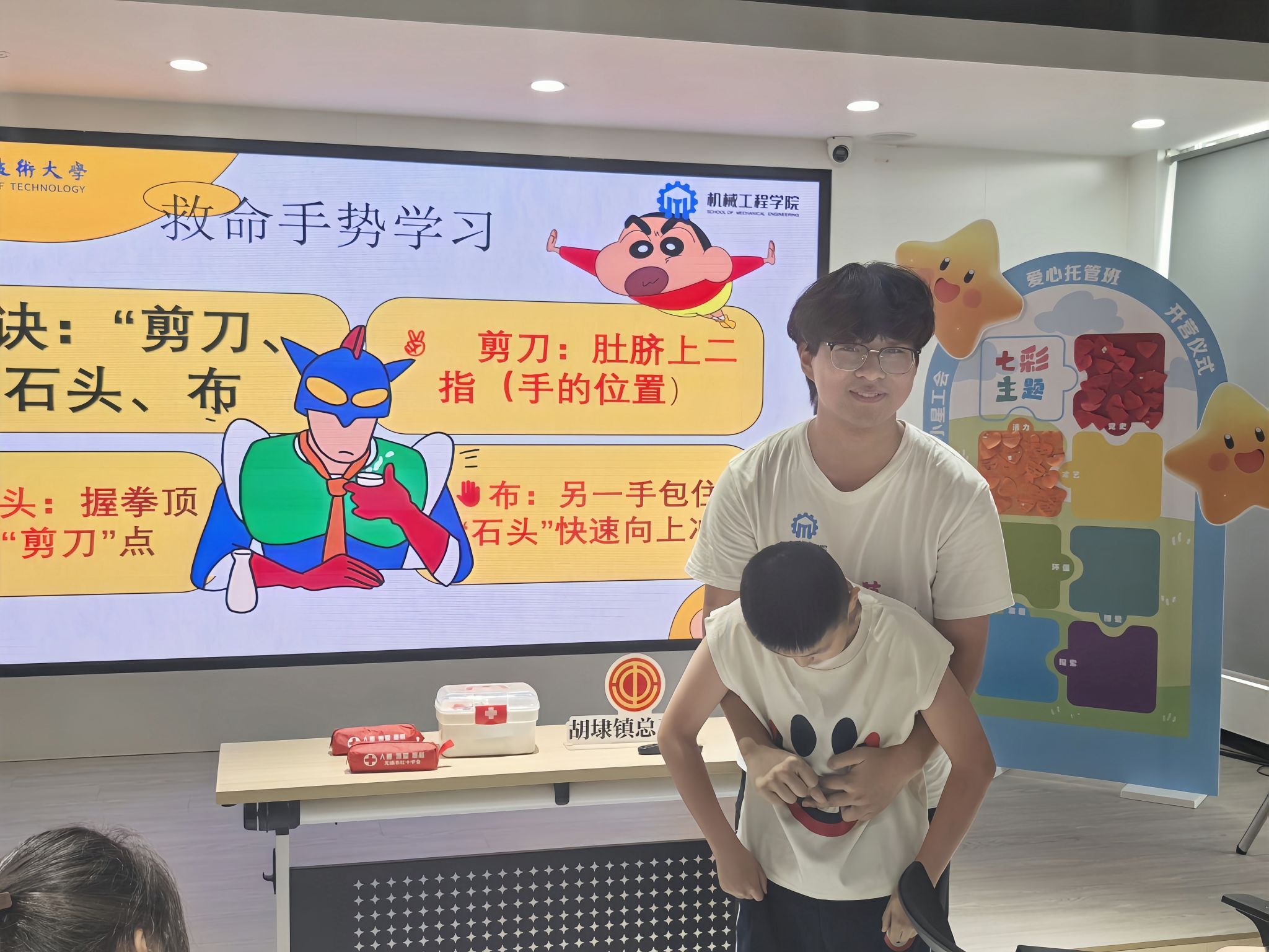 “剪刀、石头、布——”朗朗上口的三步口诀揭开急救技能实训序幕。实践团成员们化身“安全教练”,手把手指导孩子们定位脐上二指的“剪刀”位,握拳顶住的“石头”点,最后用“布”包裹实施冲击。为了加深孩子们的理解,实践团成员组织孩子们两人一组,用气球模拟练习手势,并提醒他们实际操作时不可发力,且仅对“清醒且无法咳嗽”的人使用。