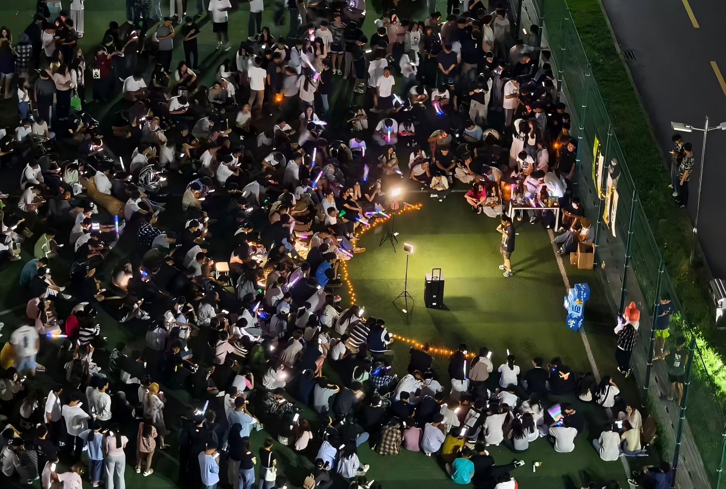 随着夜色降临,现场新生手持的荧光棒陆续点亮,沿人群流动方向形成“星河”状视觉效果。音乐响起后,新生们纷纷举起手臂跟随节奏挥舞,并共同合唱经典曲目,现场歌声持续回荡。新生们在《光辉岁月》《我的未来式》《星辰大海》等青春曲目的共鸣中,开启了对大学生活的美好憧憬,此次音乐节既有新生歌手带来的流行金曲,用清澈嗓音传递青春心事;也有乐器爱好者现场演奏的摇滚曲目,强劲节奏点燃全场热情,更有学校舞蹈社团的伴舞表演,动感舞姿为音乐增添别样活力。