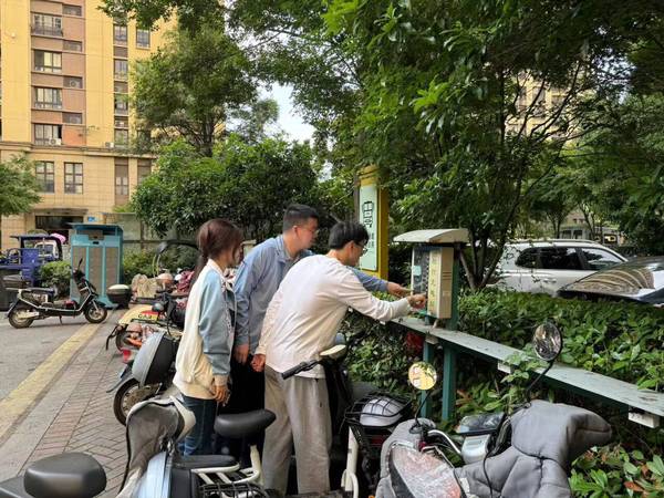 在充电车棚,同学们为社区居民现场讲解电动车充电装置的充电方法、使用流程,为居民操作使用上的不便答疑解惑,提醒大家在停放和充电时要遵循相关规定,消除电动车上楼带来的安全隐患。此外,同学们还和社区工作人员一起探讨交流了小区集中充电装置的优化、消防通道的规范标准、安全出入口的保持畅通等社区治理情况,并配合社区工作人员开展了灭火器材的完好有效性点检,以及电线私拉乱接现象等问题的安全排查。