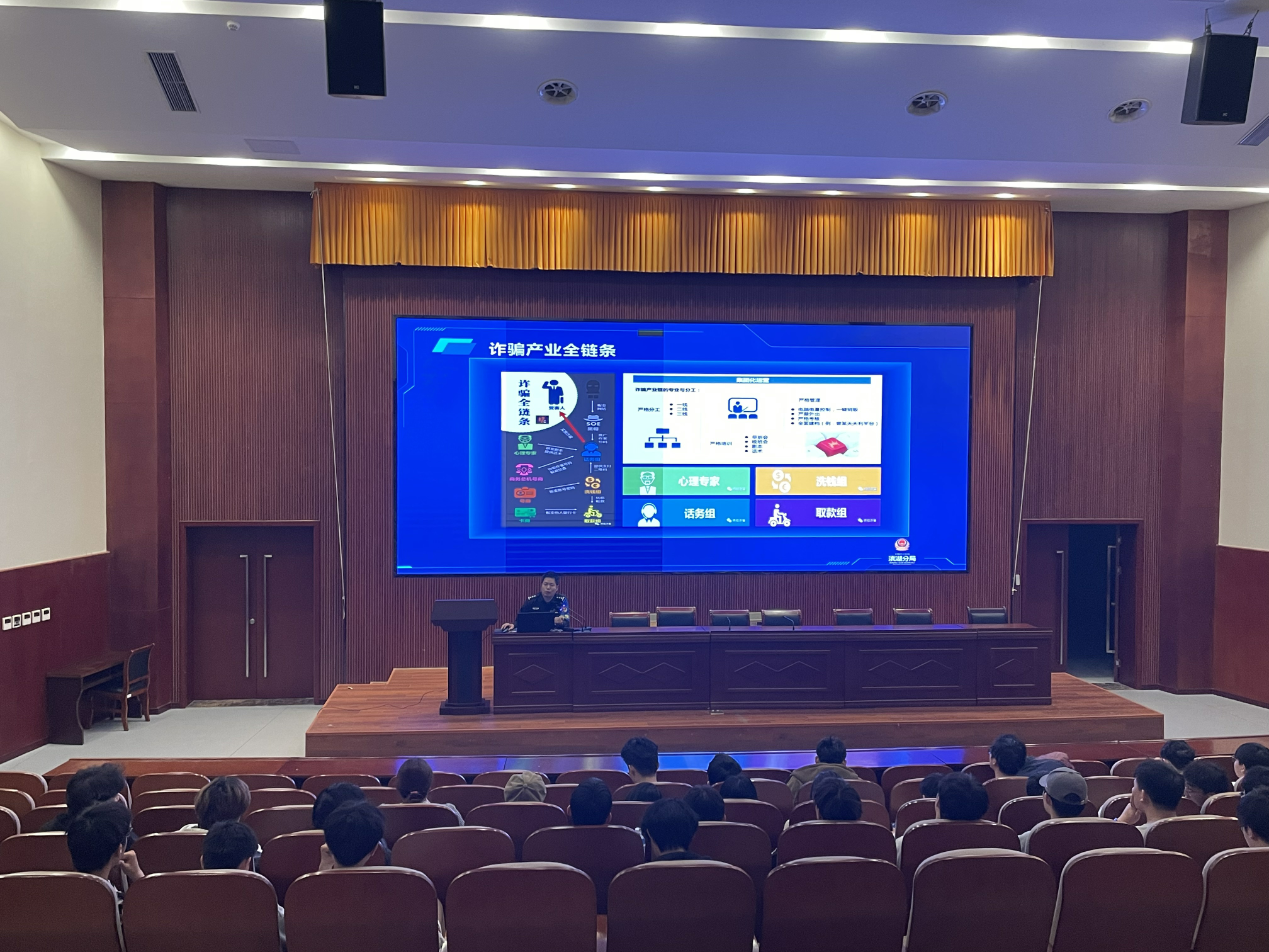 两位警官围绕新型诈骗的手段、实体引流方式、洗钱方式等方面进行讲解,用身边案例提醒同学们在日常生活中要擦亮眼睛,不要贪心,消除侥幸心理,面对不法分子的诱骗坚决抵制诱惑。两位警官深入剖析了犯罪分子作案套路,并分别给出应对方法,警示同学们在校学习期间要提高新型网络诈骗的识别能力和防范意识,确保人身及财产安全。
