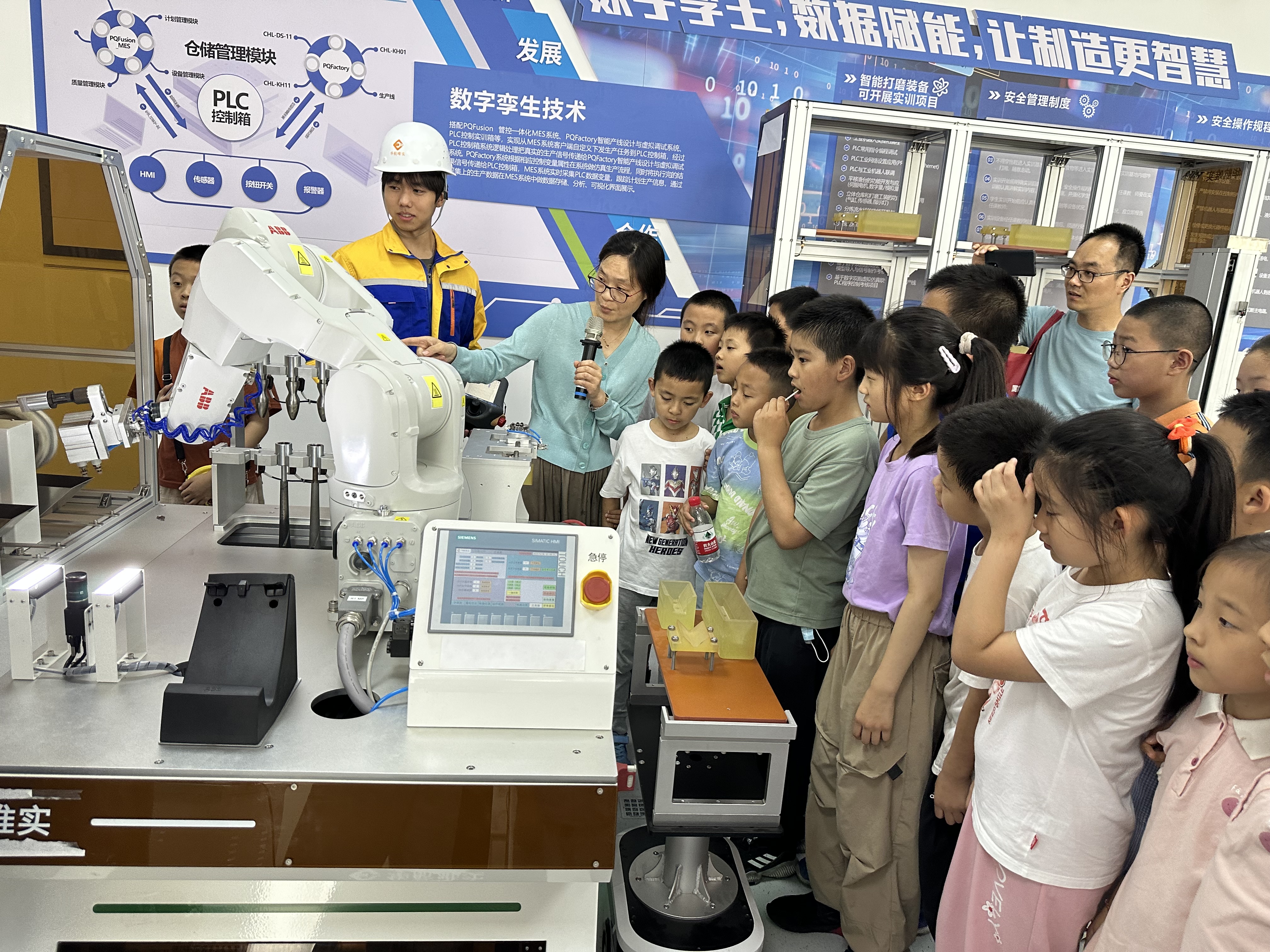 趣味科普课堂上,周丽老师带领同学们了解了学院增材制造、精密铸造、智能装备、工业视觉等实验室建设情况。职业体验课堂上,机电一体化技术专业主任唐霞老师带领创新团队学生成员,为同学们介绍了冬奥会飞扬火炬外壳打磨的科技,展示了自动导引小车运作、机械臂取材、数字模型和真实设备同步运行,让同学们了解了火炬打磨系统的出库、打磨、入库的全流程,同学们畅游在乐趣丰富的科技活动之中,感知科技的魅力。党史学习教育课堂上,学生第一党支部“红色讲解员”通过讲述建党与红船故事、播放视频“红色的故事”、红船手工制作等环节,推动学生党员当好“红船精神”的坚定捍卫者、忠实传承者、自觉践行者,在创新、奋斗、服务中学习实践中国共产党的建党精神,引导青少年听党话、感党恩、跟党走,树立理想,增长本领,立志成为社会主义建设者和接班人。