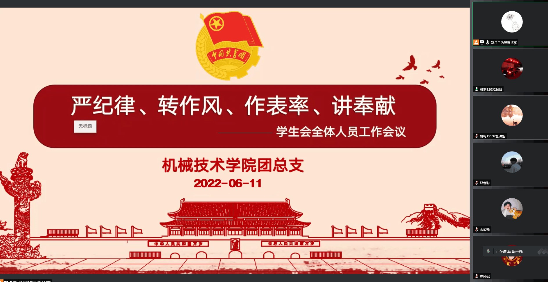 深入学习习近平总书记在庆祝中国共产主义青年团成立100周年大会上重要讲话精神,积极引导青年学子不忘初心,勇担使命,心怀“国之大者”,奋力走在前列,以昂扬的奋斗姿态迎接党的二十大召开,6月11日16:00,机械技术学院分团委学生会全体成员开展“严纪律、转作风、作表率、讲奉献”学习会,会议由分团委负责人靳丹丹老师主持。