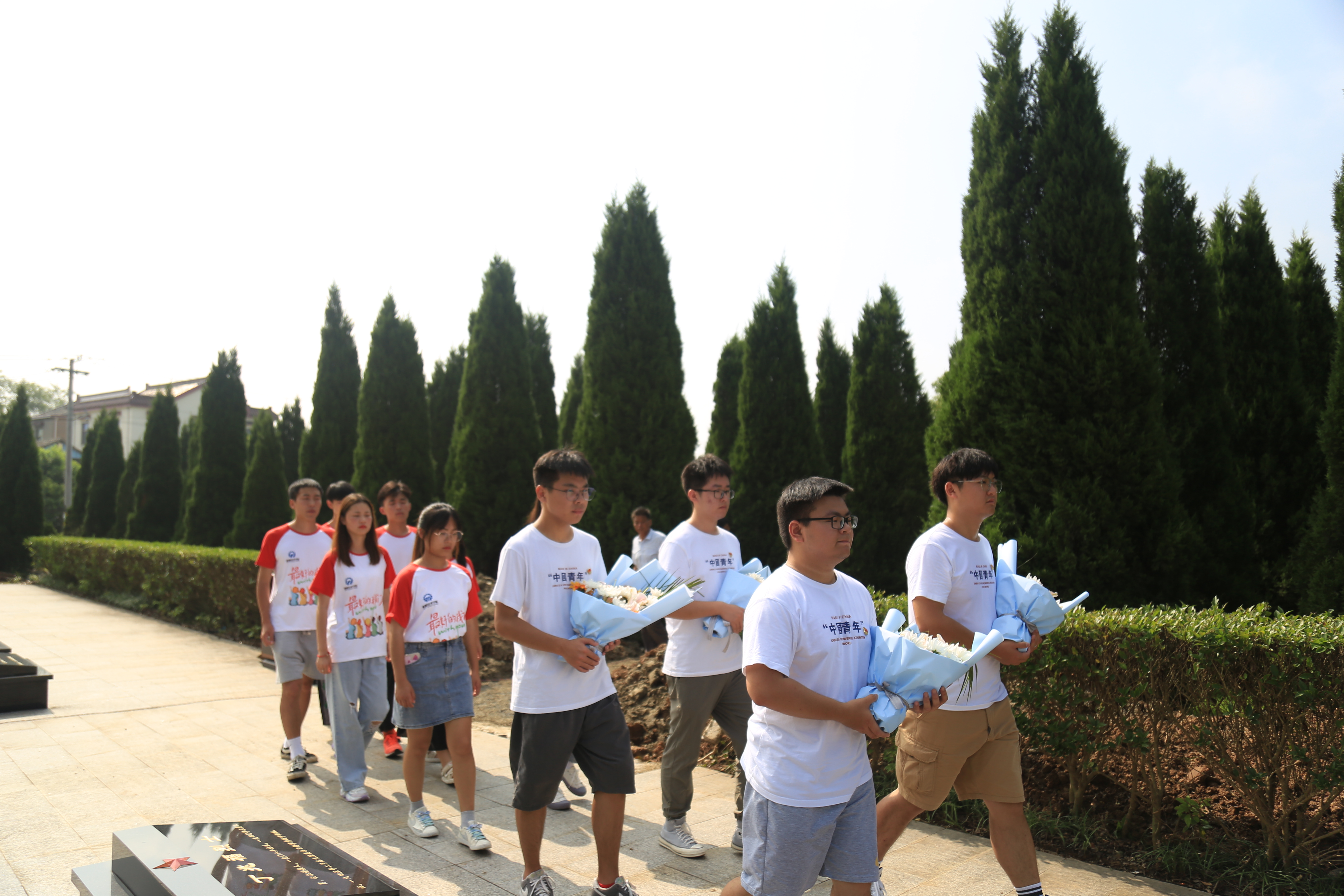 在烈士陵园,志愿者们给革命烈士献花