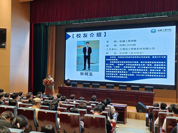本次讲座邀请了我院2016级校友张明玉和就职于中科微至科技有限公司的许潮涌及张思雨校友。讲座中,张明玉分享了自己在校的求学经历、毕业后的职业选择以及后来的创业历程,用自己成长的故事激励在校学生要认真学习,掌握扎实技能,积极尝试新事物,并为未来的职业生涯做好充足准备。许潮涌及张思雨介绍了机械领域各专业发展和行业现状,并结合本公司的具体案例,为学生们上了一节生动的专业认知课,极大地激发了学生对专业学习的浓厚兴趣。