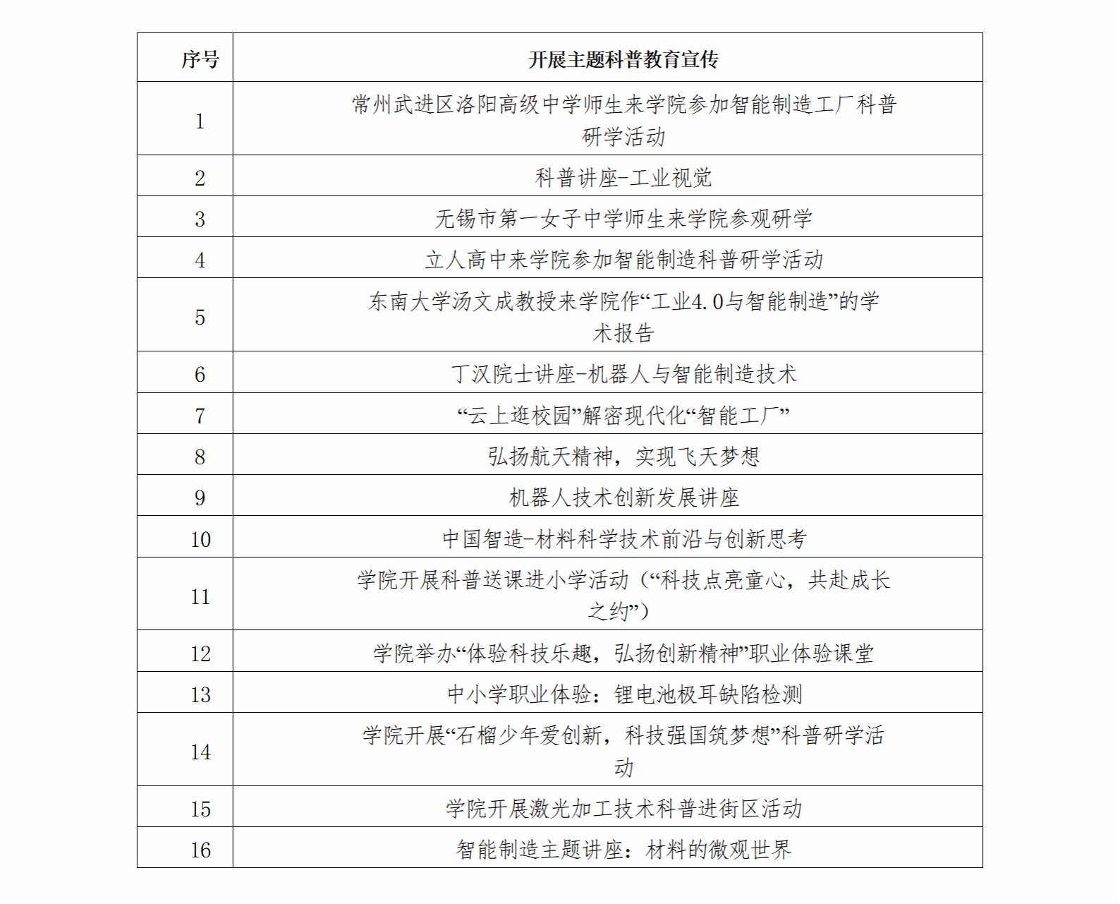 机械工程学院历来重视科普教育工作。为了将科技成果转化为推动提升学生的科学文化素养、服务社会公众“学科学、讲科学”需求的力量源泉,学院利用智能制造工程中心科技资源,学院以智能制造工程中心为核心,打造了江苏省教育科研类科普教育基地。基地整合了“工业机器人集成应用”等9项先进制造领域的主题科普教育资源,面向学生和和社会公众开放,开展科学技术教育、传播与普及活动;为学校服务地方经济建设、提高技术服务能力搭建了示范平台。